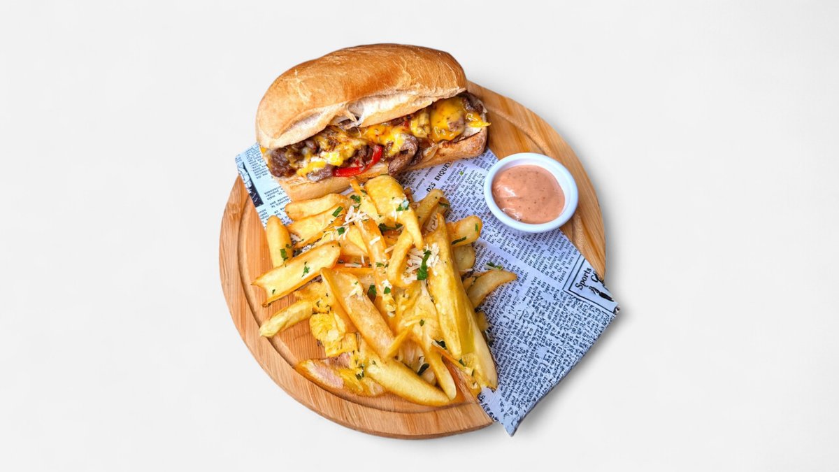 Ciabatta bread, grilled ribeye steak with onion and melted cheese, served with Gravy sauce and French fries with parmesan and garlic. Paine ciabatta, antricot din vita la gratar si sos cald din branza ceddar, servit cu sos Gravy si cartofi prajiti cu parmezan si usturoi. 350g