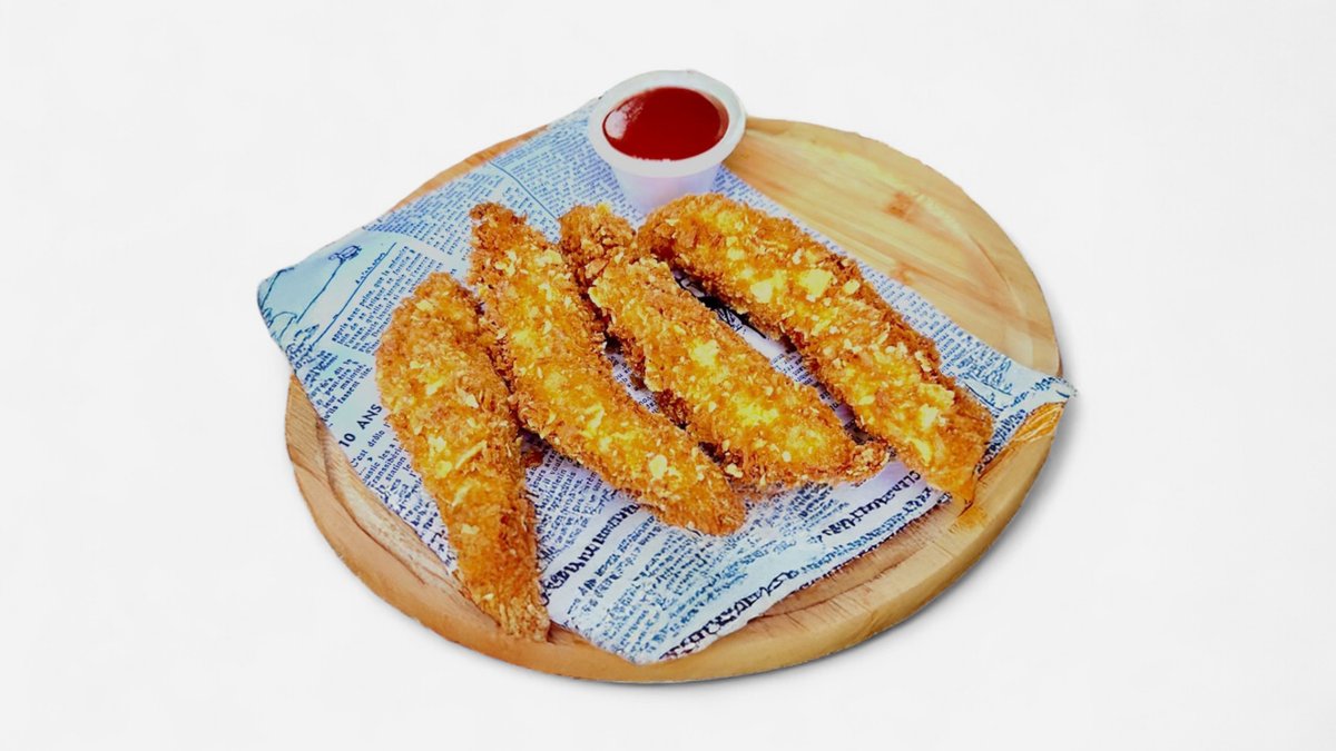 Strips crocante din pui, aurii si suculente, servite cu ketchup. Crispy, golden chicken strips served with ketchup. 350g