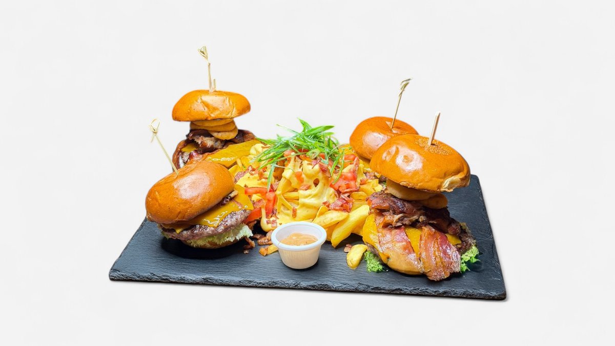 O colectie spectaculoasa cu cei mai indragiti burgeri ai nostri: Godfather, Royale with cheese, Melted Royale si Jalapeno Smashed, serviti cu loaded fries. Toti actorii principali, pe un singur platou. A spectacular lineup featuring our most iconic burgers: Godfather, Royale with cheese, Melted Royale and Jalapeno Smashed, served with loaded fries. All the main stars on the same set! 1800g