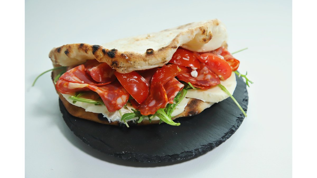 Crème Blanche Gastro, fior di latte Sorrentina, salami, roșii cherry, rucola, ulei de măsline EV Basso