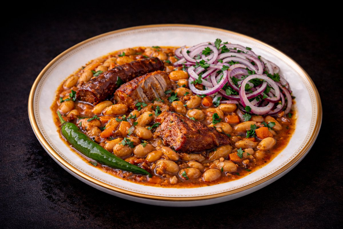 Iahnie de fasole cu afumatură și salată de ceapă