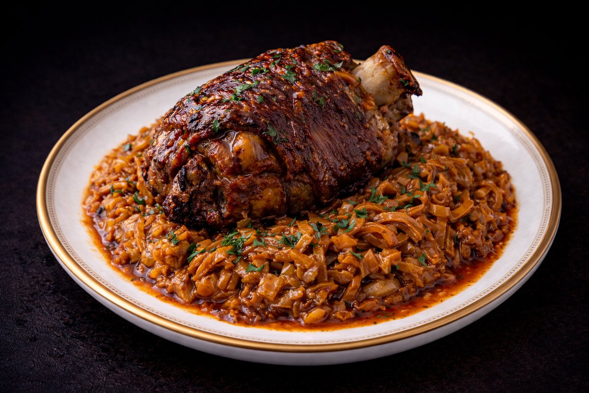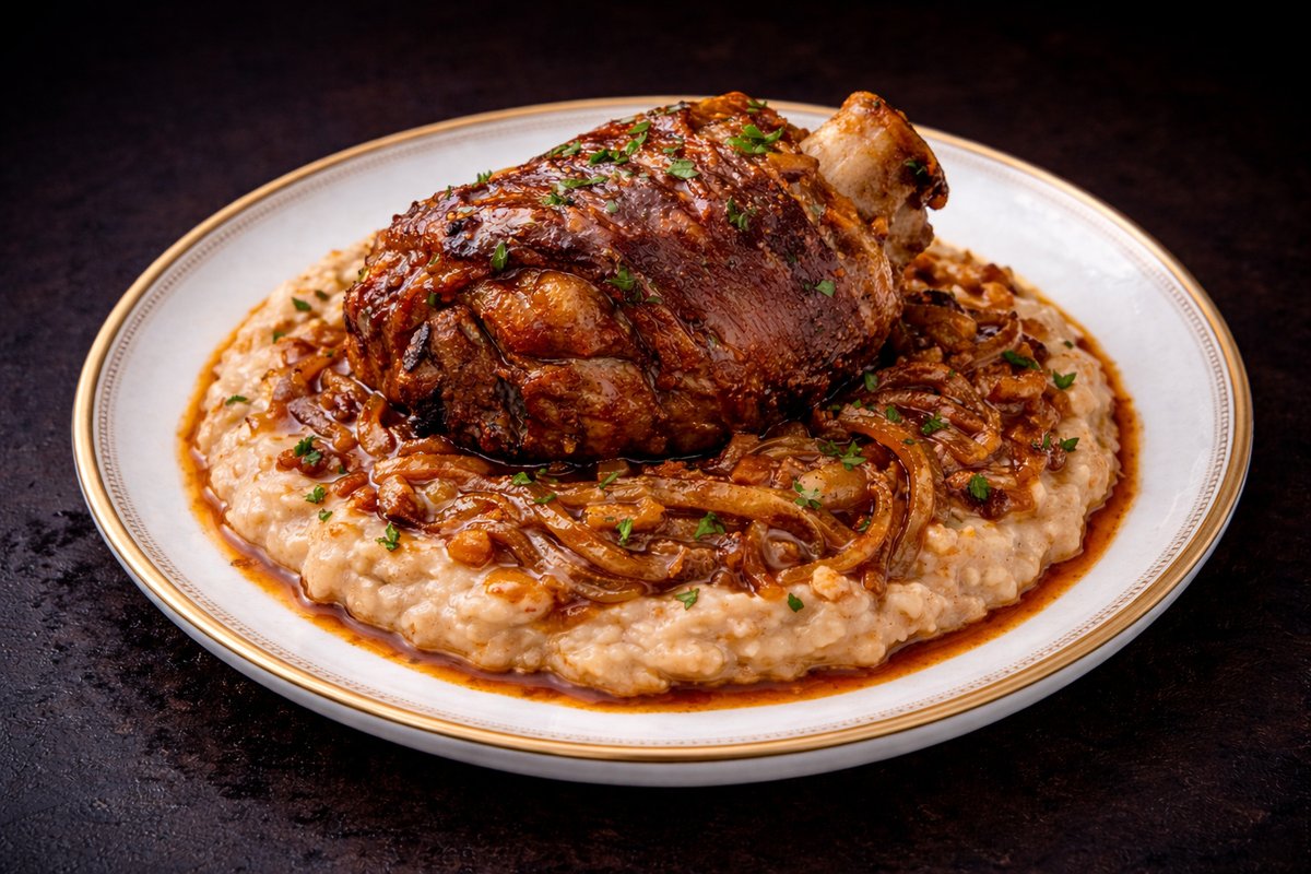 Carne de porc cu os, fasole bătuță cu ceapă caramelizată - 200g