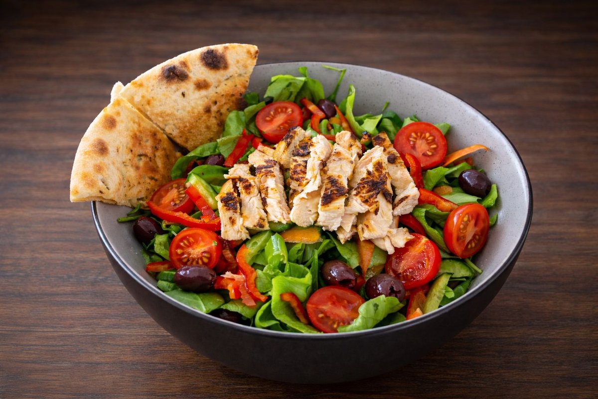 Mix de salată, roșii, castraveți, piept de pui (80g), ardei gras, măsline, focaccia, 500gValoare energetică: 550 kcalAlergeni: Gluten (focaccia), posibil proteine din carne de pasăre (pui)