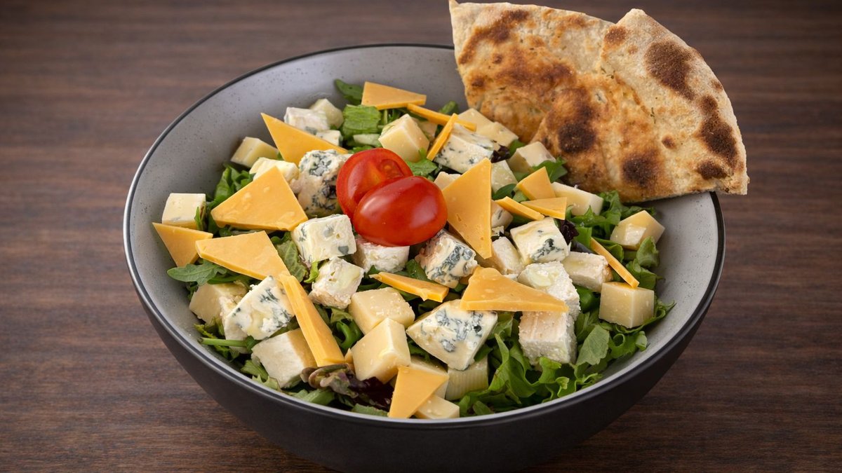 Mix de salată, castraveți, brânză feta, mozzarella, gorgonzola, cheddar, focaccia - 400g
