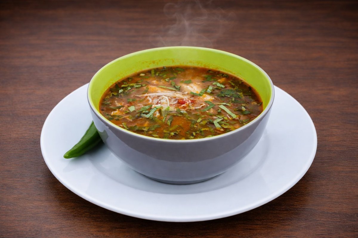 Cocoș de casă, tăiței, borș, leuștean, ardei gras, ceapă, morcovi, rădăcină pătrunjel, țelină, roșii, borș, leuștean -450g