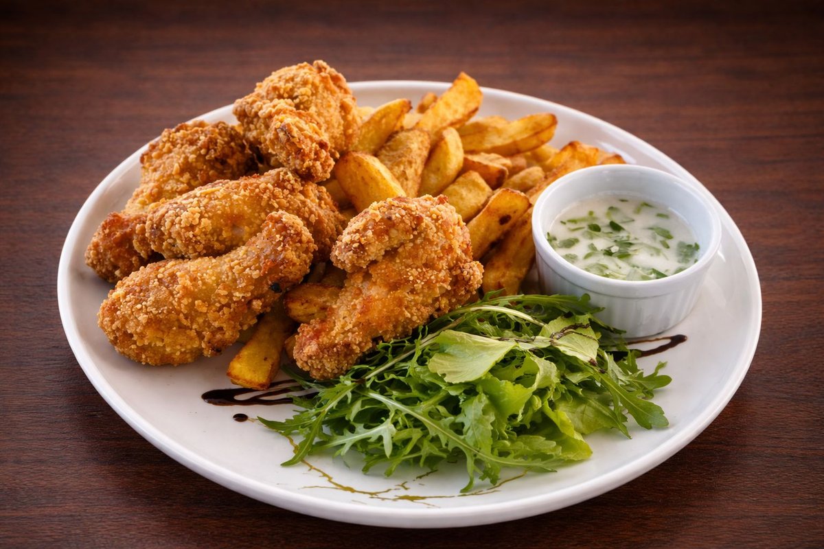 Aripioare picante cu cartofi prăjiți și maioneză cu usturoi