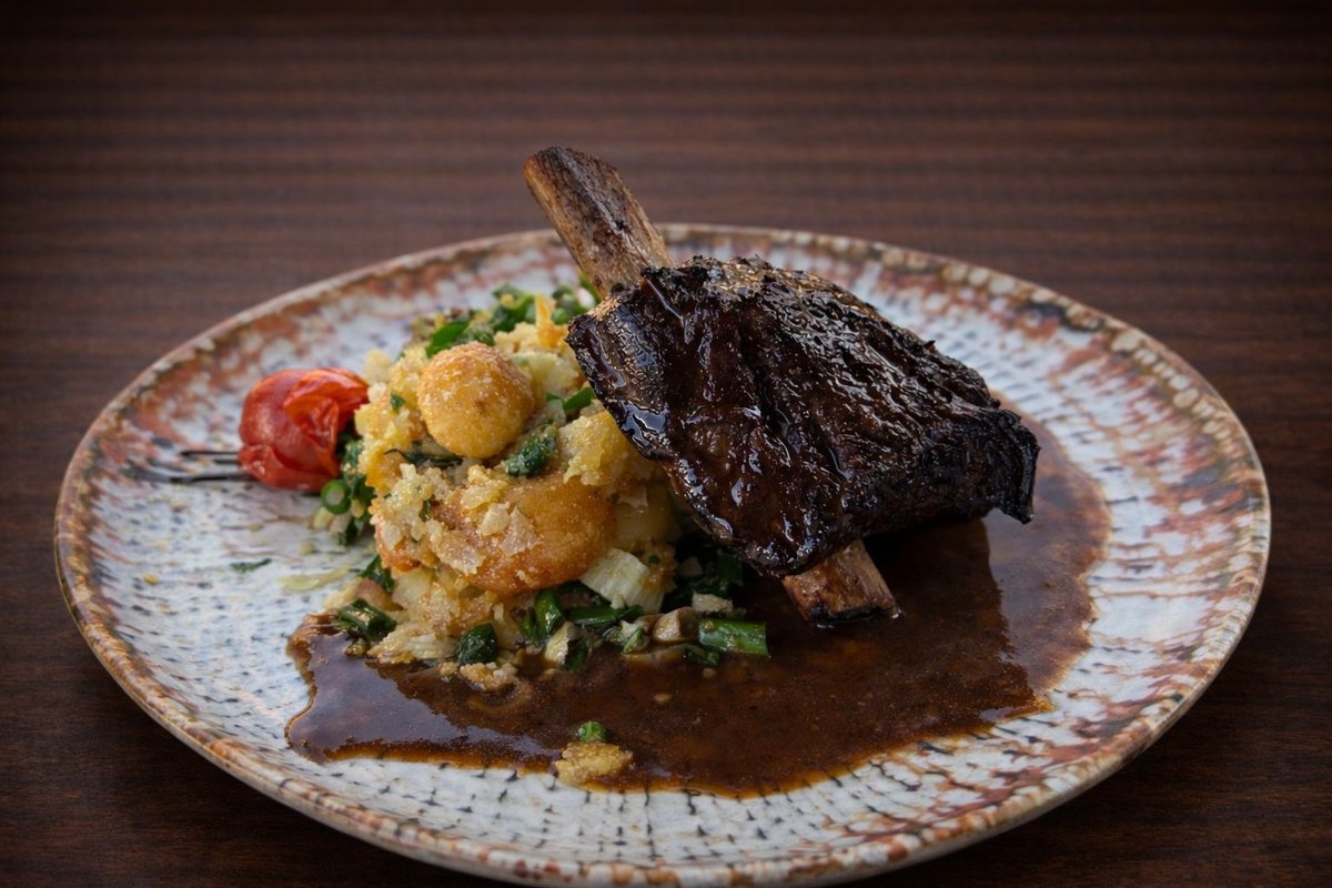 Coastă de vită la cuptor din produs sous vide decongelat, cartof copt zdrobit, sos sweet chilli și bbq - 350g