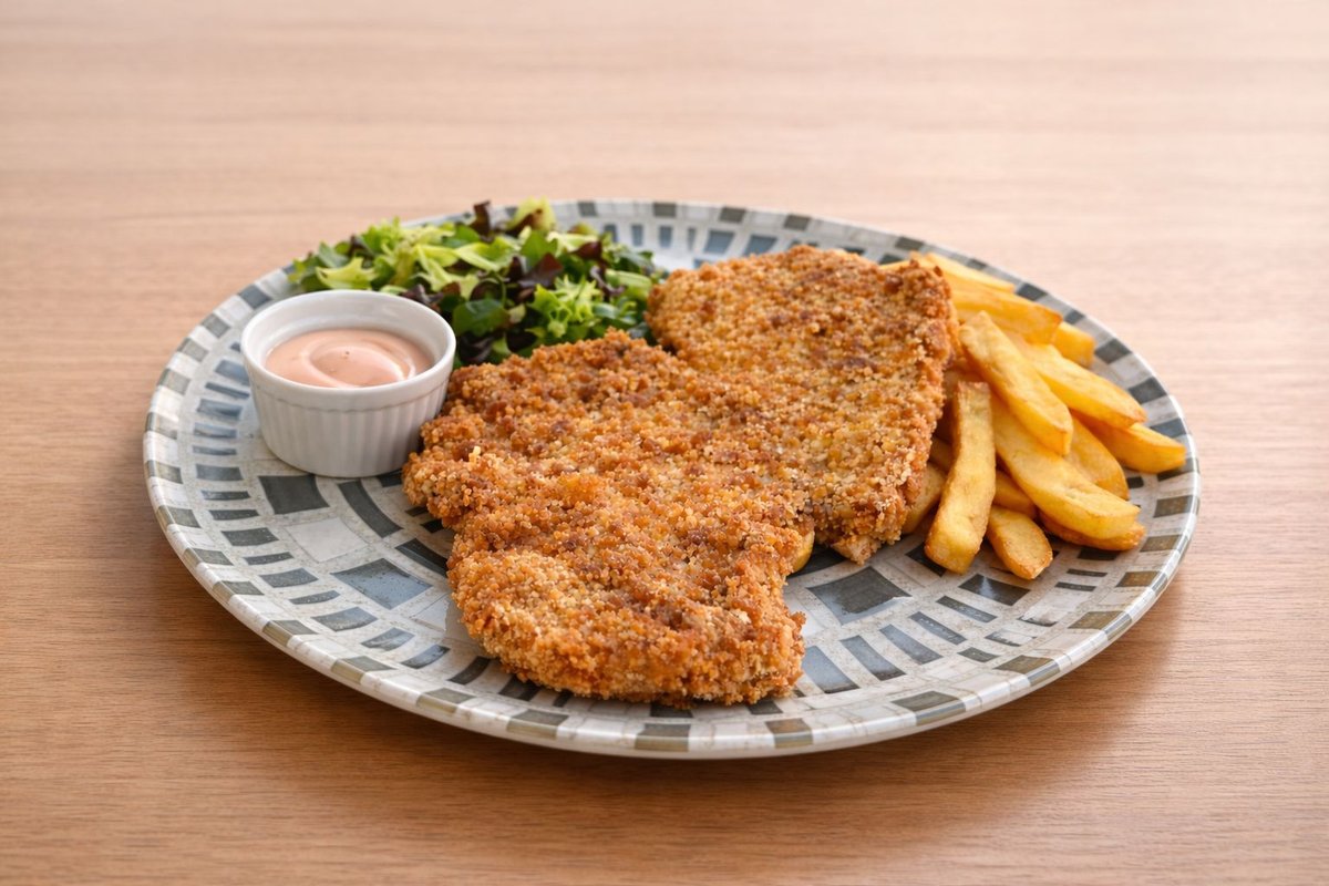 Cotlet de porc cu os din produs decongelat, făină, ou, pesmet, mix de salată, maioneză, muștar, cartofi prăjiți - 550g