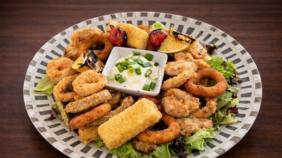 Creveți și calamari din produs decongelat, dovlecei, inele de ceapă, brânză, sos de maioneza cu usturoi, roșii cherry, lămâie - 400g