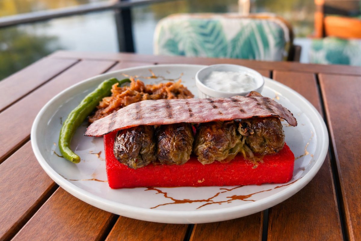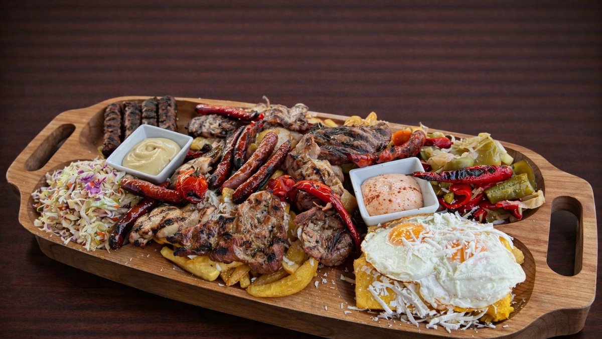 Ceafă de porc, patru mici, pulpă dezosată, cârnați la grill, cartofi prăjiți, mămăligă, brânză rasă și ou ochi, murături, ardei copți, mujdei