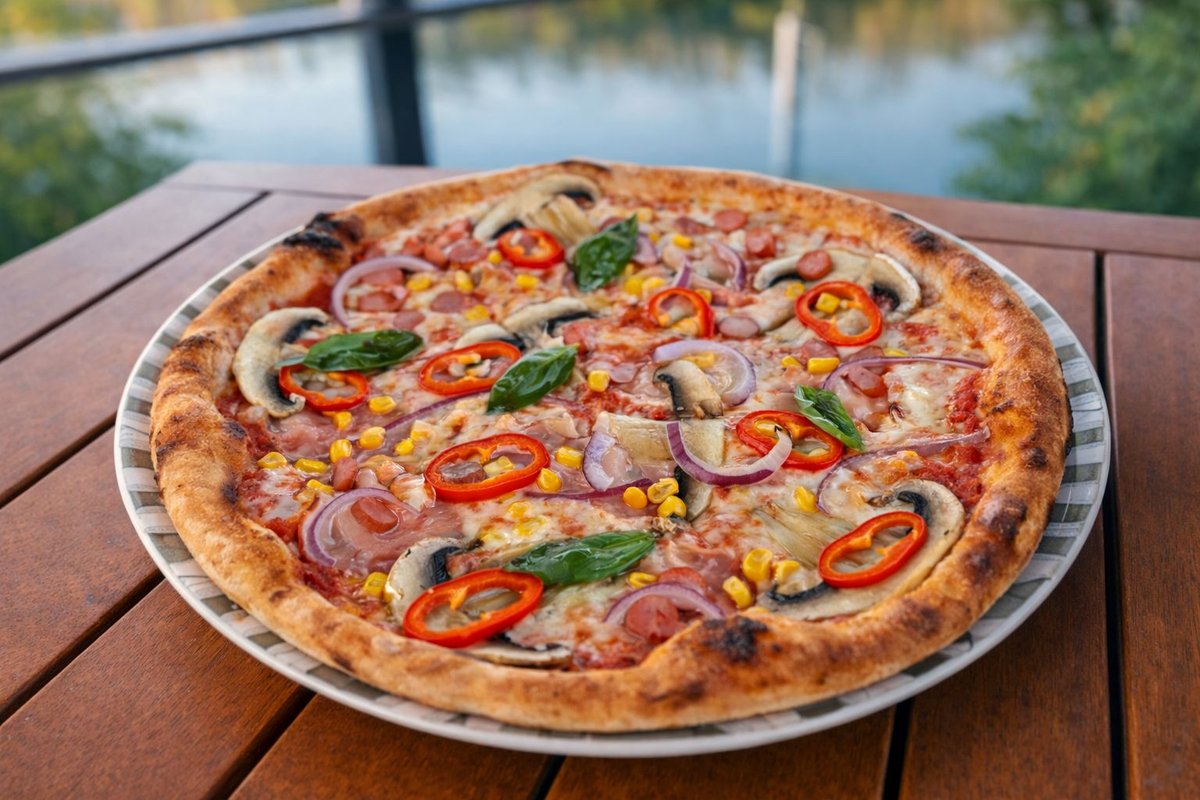 Blat, sos de roșii, mozzarella, bacon, cârnați, ceapă, ardei, porumb, ciuperci - 500g