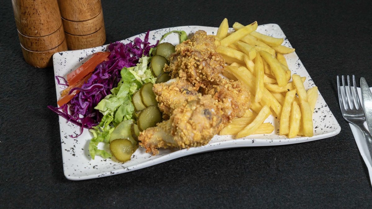 Pulpa de pui la gratar - 400g, aripioare pane - 272g, strips - 232g, mici - 208g, Salata Fresh - 200g, cartofi prajiti - 200g, Chifla - 180g, cascaval pane - 150g
