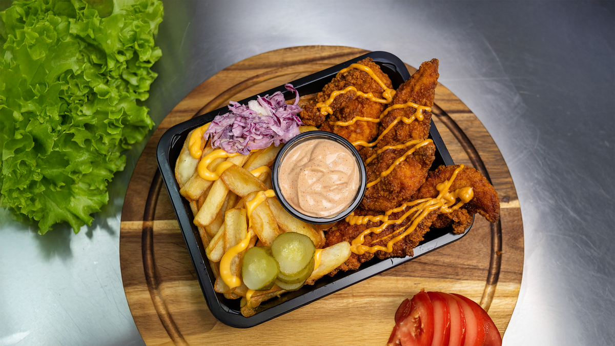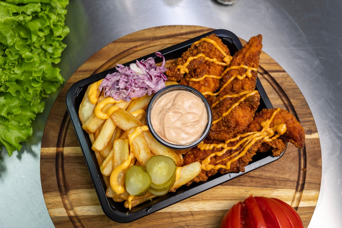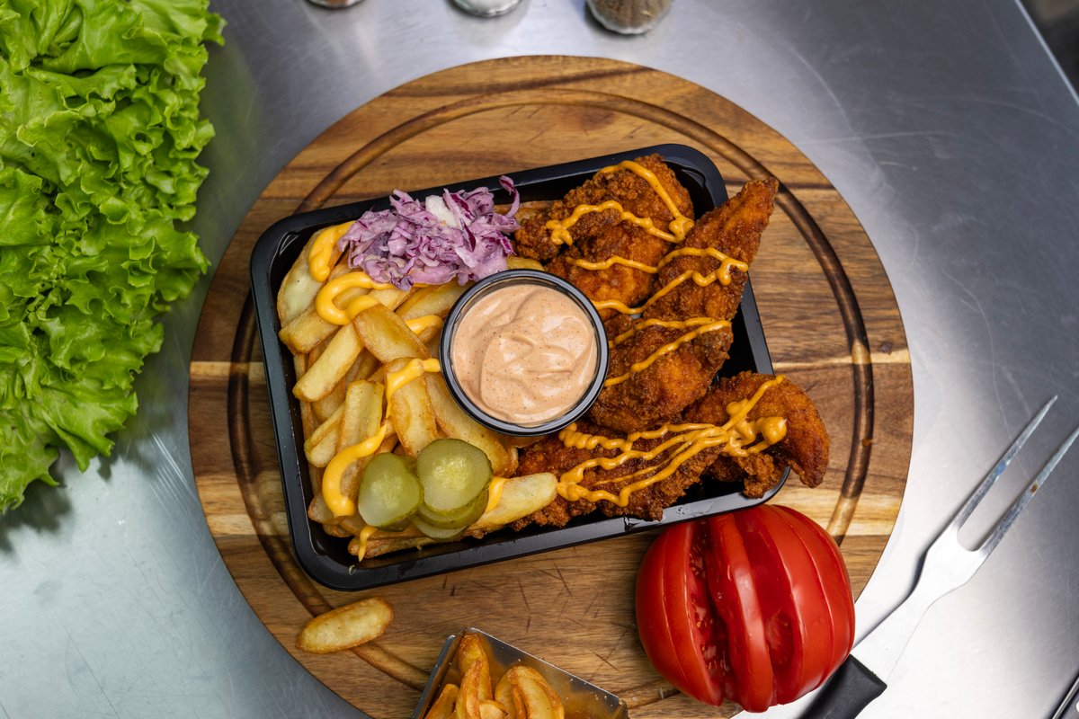 3 crispy strips condimentat in marinada cartofi prajiti dippers sos topping salata coleslaw castraveti murati sos dipping