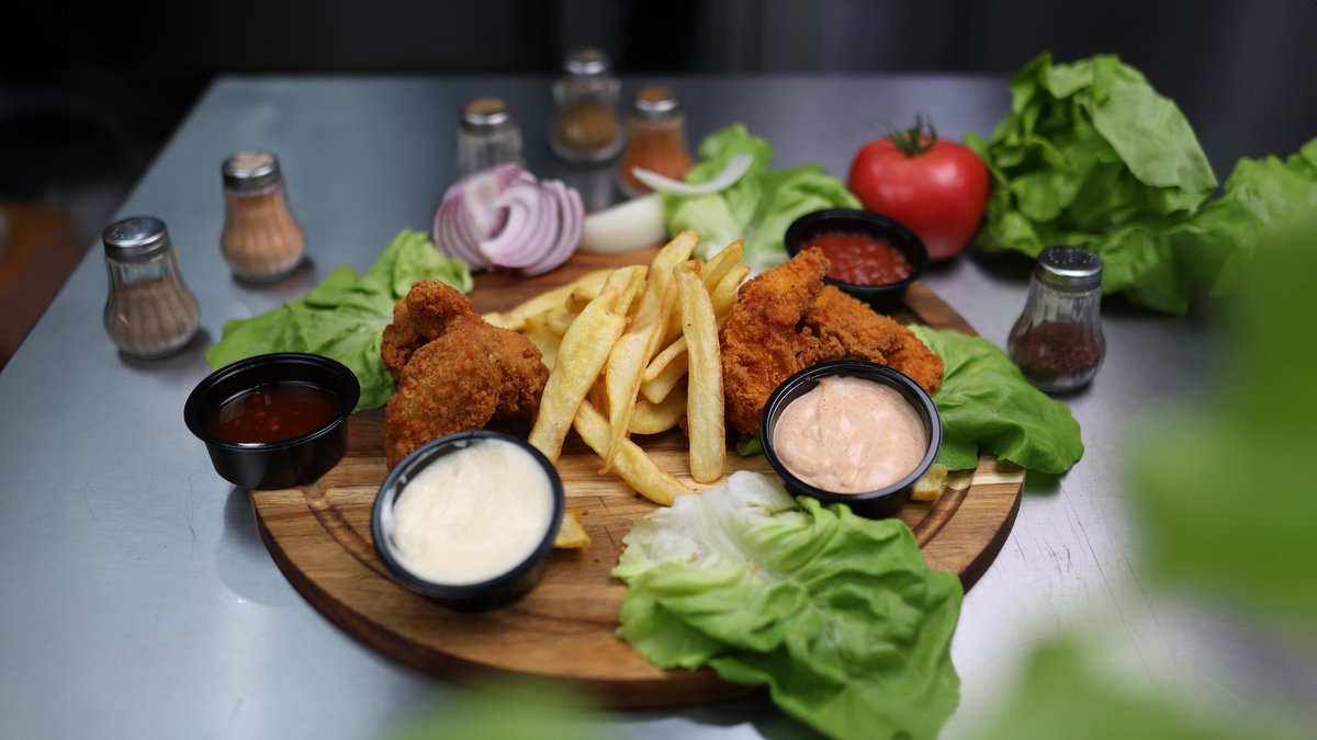 (8 aripioare strips, 8 crispy strips, 2 portii cartofi prajiti, 2 sosuri usturoi libanez) - 1280g