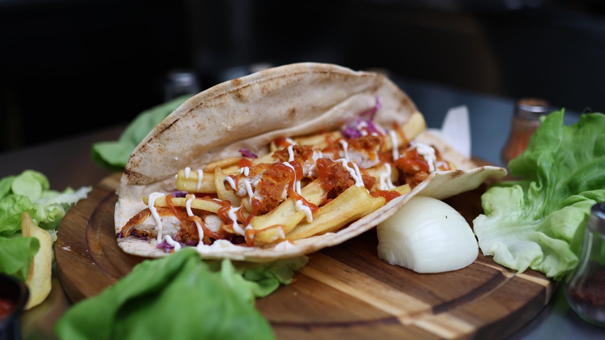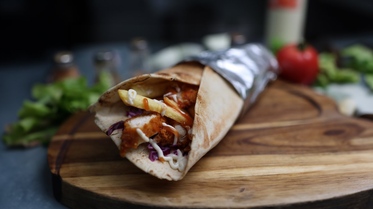 (crispy strips de pui 80g, cartofi prajiti 70g, salata de varza rosie 20g, sos de usturoi libanez 20g, ketchup 20g, maioneza simpla 20g, lipie libaneza 45g) - 275g