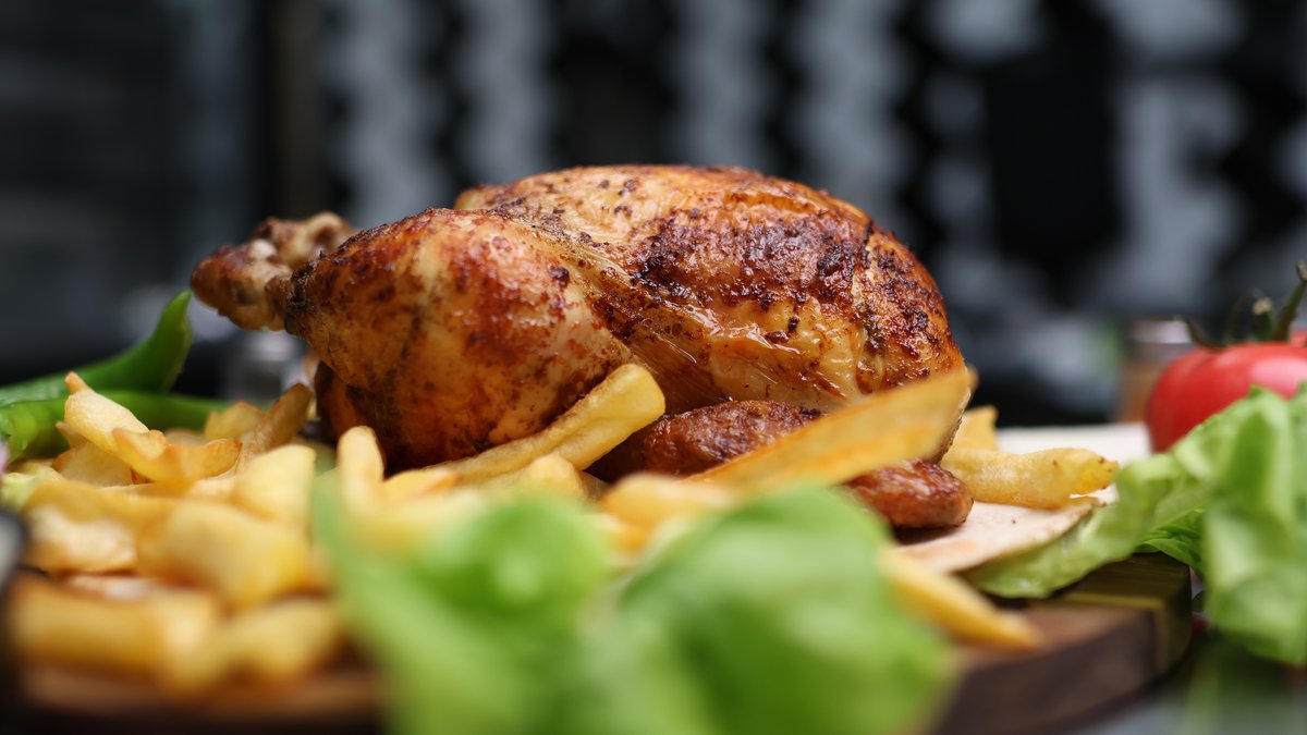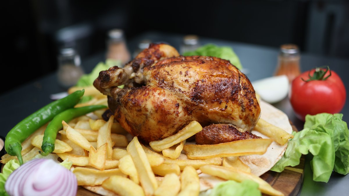Pui proaspat la rotisor macerat in condimente orientale cu scortisoara si foi de dafin. (pui la rotisor 1000g, lipie 60g, cartofi prajiti 200g, sos 40g) -1300g