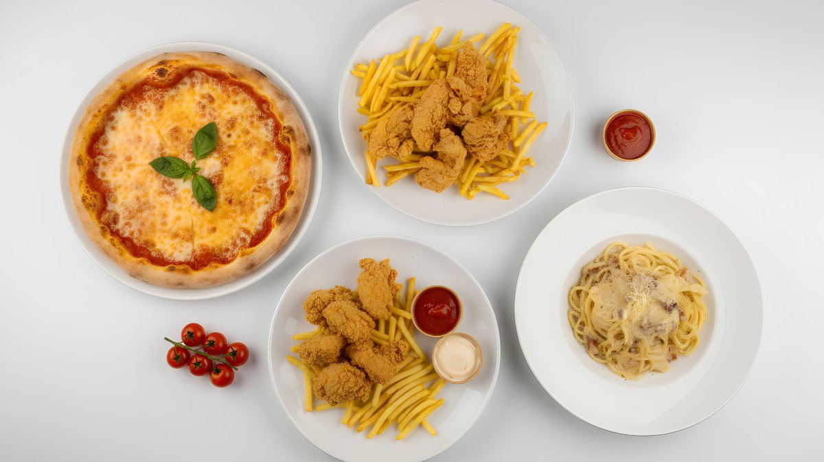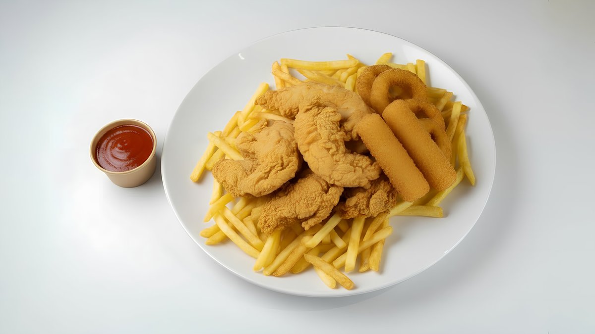 3 buc. muschiuleț pui (180 g), 3 buc. aripioare pui (90 g) în crustă crocantă, mix condimente, 2 buc. mozzarella sticks (40 g), 4 buc. onion rings (40 g), porție mare cartofi (150 g), 1 sos la alegere - 450 g