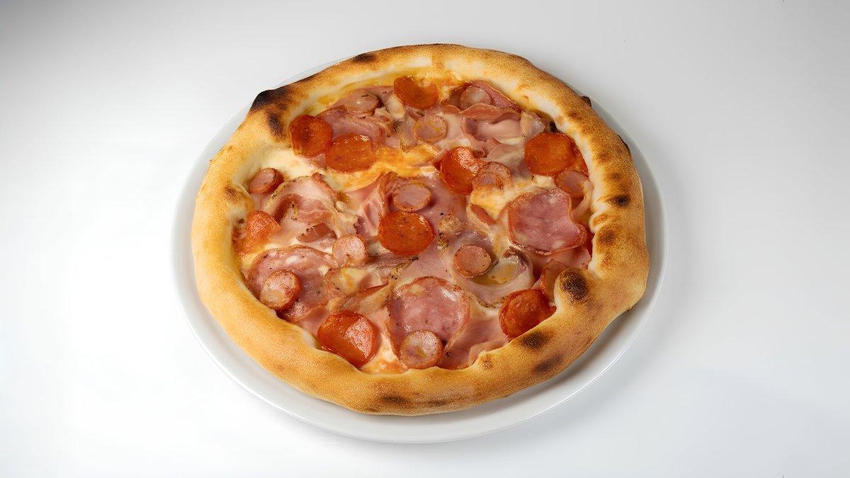 Sos roșii, mozarella, salam, prosciutto cotto, salam picant, guanciale, cârnați - 450 g