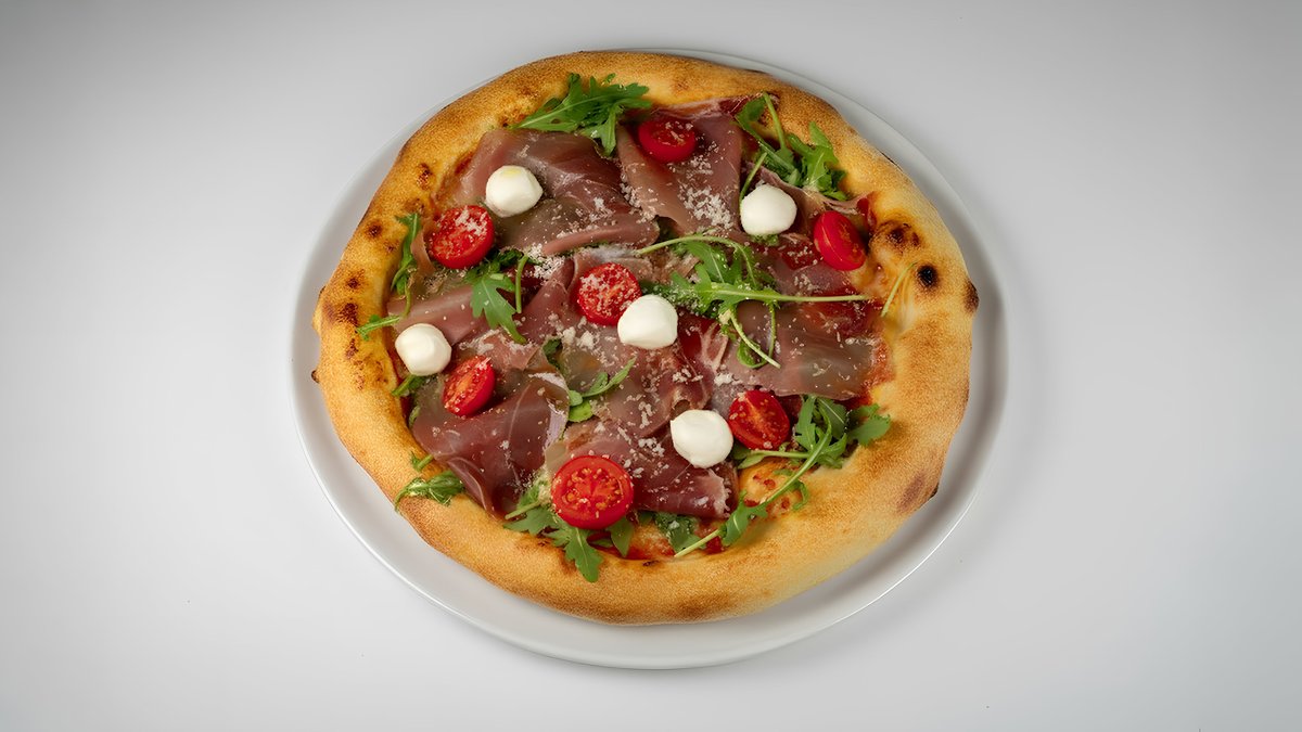 Sos roșii, mozarella, prosciutto crudo, rucola, roșii cherry, parmezan, bocconcini - 1150 g