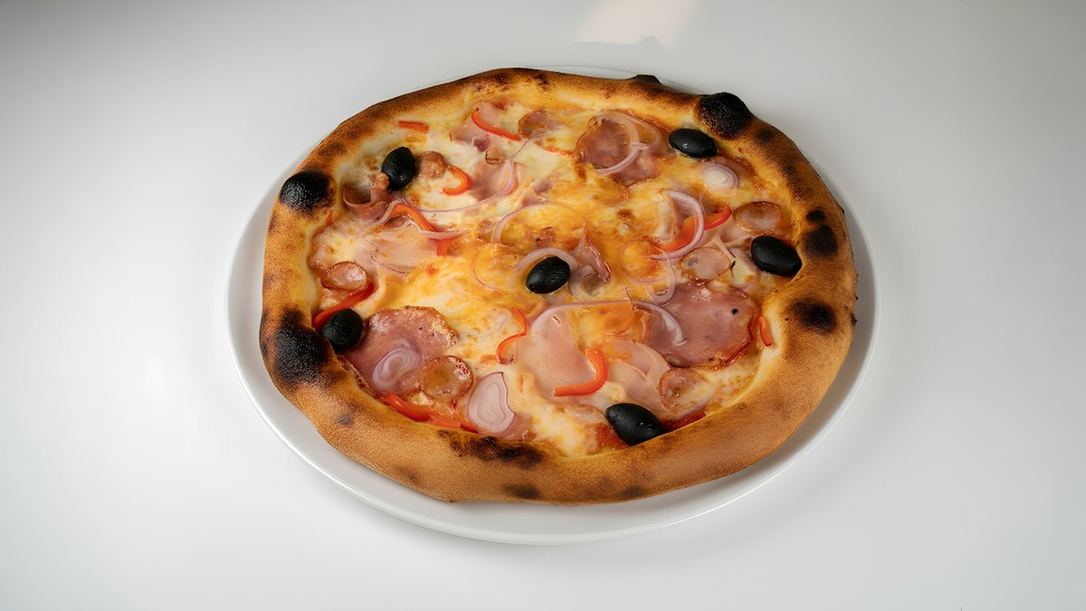 Sos roșii, mozarella, salam, cârnați, prosciutto cotto , măsline, ardei gras, ceapă - 1250 g
