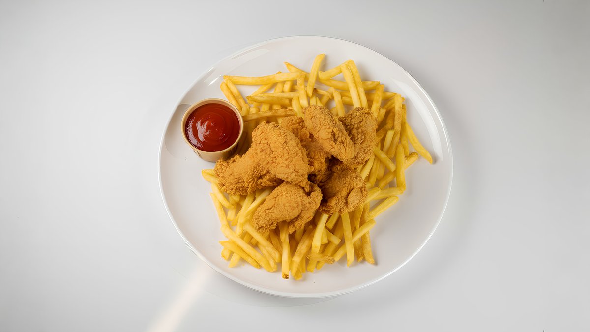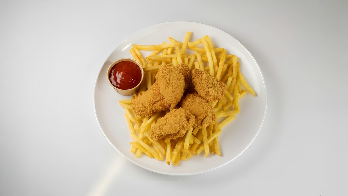 3 buc. muschiuleț pui (120 g), 4 buc. aripioare pui (80 g) în crustă crocantă, mix condimente, porție mare cartofi (150 g), 1 sos la alegere - 350 g