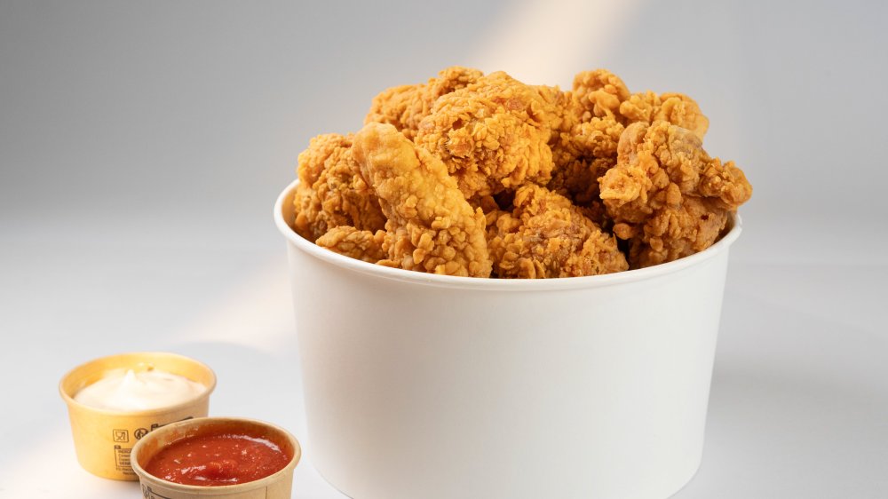 16 buc. muschiuleț pui (960g) în crustă crocantă, mix condimente, 2 porții cartofi prăjiți mare (2*150 g), 3 sosuri la alegere - 1260 g