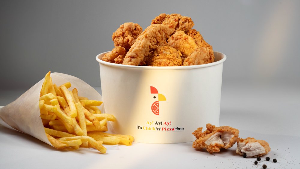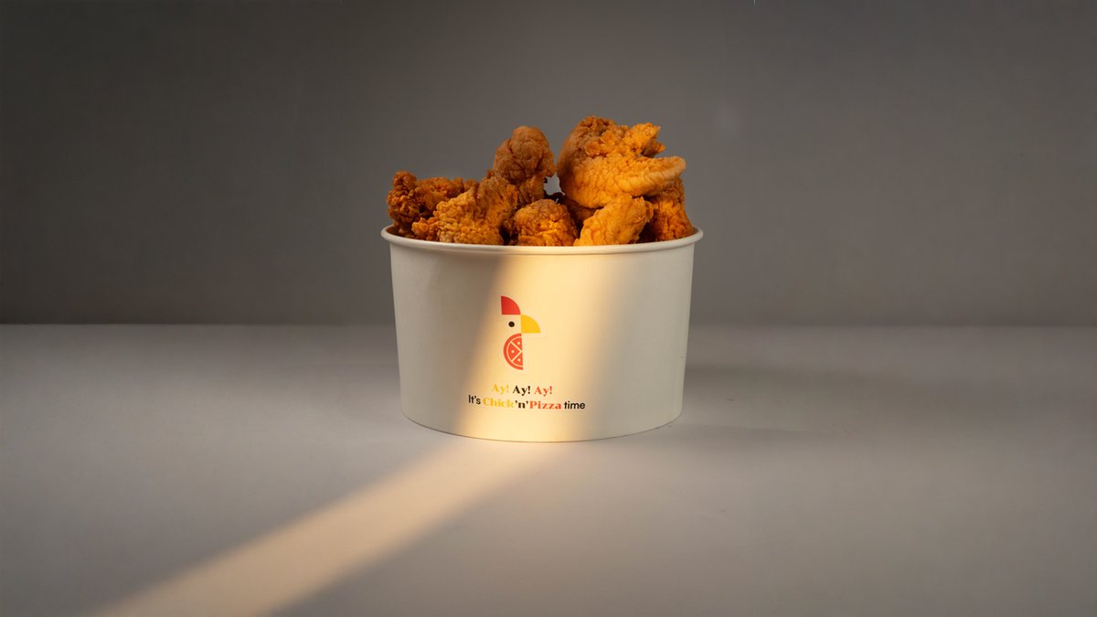 11 buc. muschiuleț pui (660 g), 11 buc. aripioare pui (330 g) în crustă crocantă, mix condimente, 4 porții cartofi prăjiți (4*150 g), 4 sosuri la alegere - 1590 g