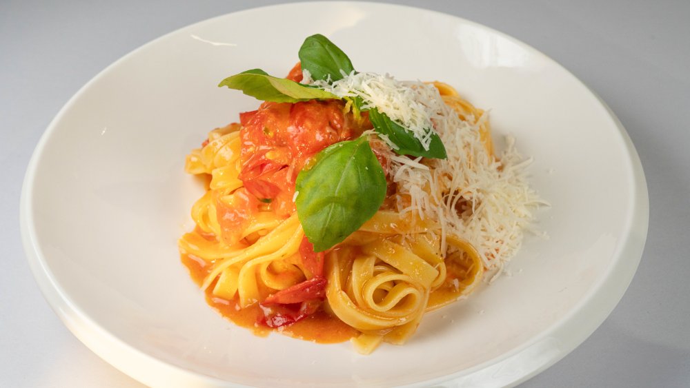 Paste proaspete, roșii cherry, sos roșii, oregano, ulei de măsline, parmezan, usturoi - 300 g