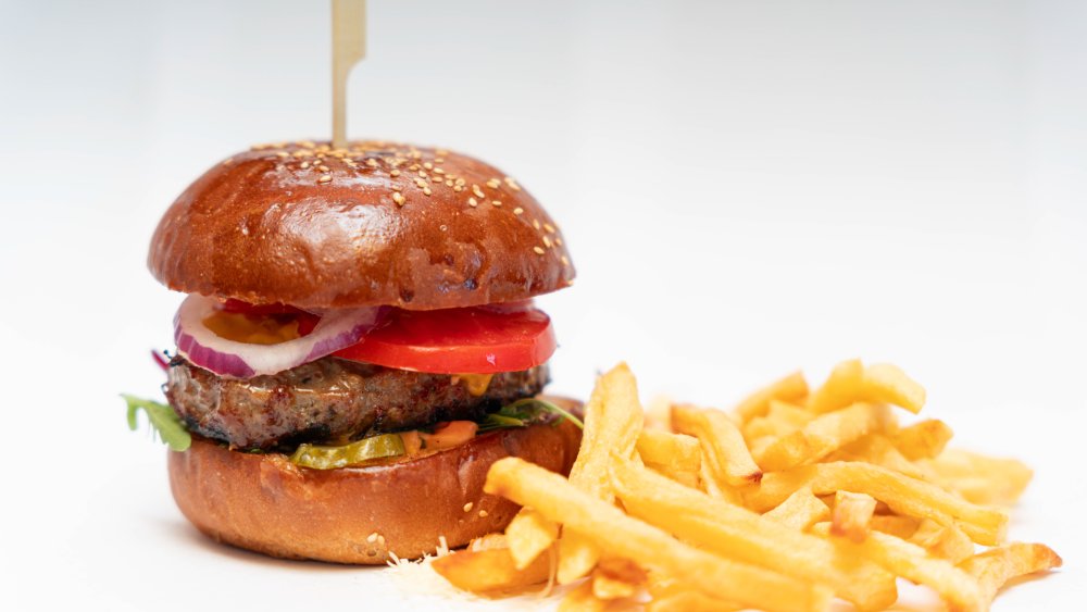 Chiflă burger, carne vită (160 g), sos maioneză, ketchup, brânză cheddar (10 g), salată iceberg, castraveți murați, roșii - 280 g