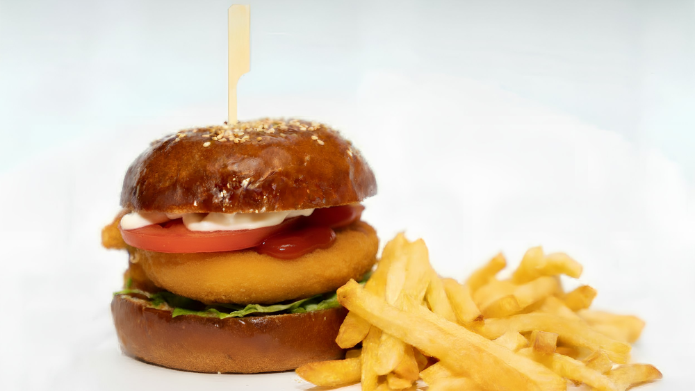 Chiflă brioche, 2 buc. muschiuleț pui (120 g) în crustă crocantă, mix condimente, maioneză, ketchup, castraveți murați, porție mică de cartofi prăjiți (120 g) - 240 g