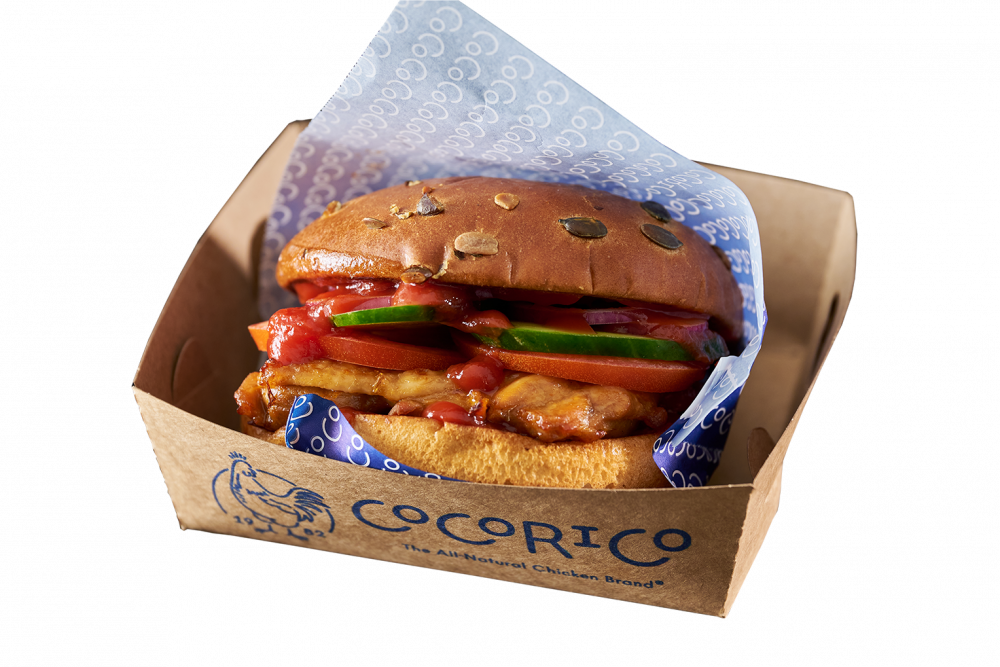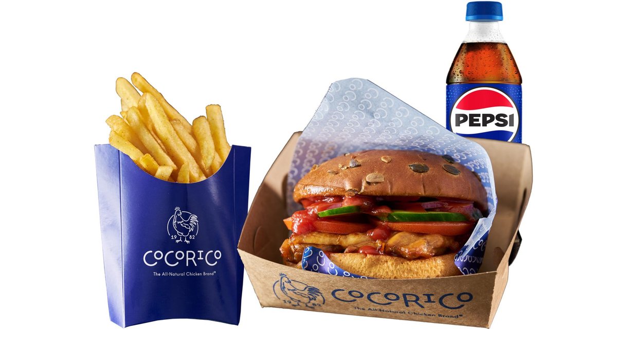 Chifla burger gourmet cu seminte dovleac 80g, cocobaked pulpa de pui 130g, rosie 40g, castravete 30g, ceapa rosie 10g, ketchup 20g, cutie burger 1 buc, coltar burger 1 buc+ 1 portie cartofi prajiti+ 1 Pepsi 500 ml
