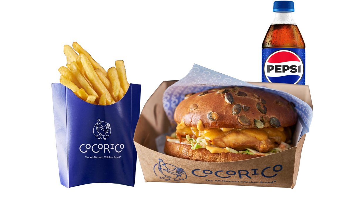Chifla burger gourmet cu seminte dovleac 80g, cocobaked pulpa de pui 130g, salata coleslaw 50g, cheddar (2felii) 30g, sos burger 20g+Portie de cartofi prajiti+ 1 Pepsi 500 ml