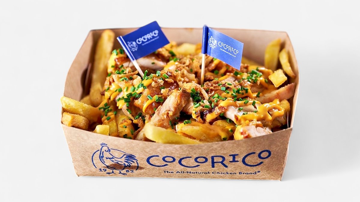 Cartofi Prajiti, Fasii de Pulpa de pui coapta Cocorico, Sos Cheddar , Sos burger MP, Ceapa crocanta ,Chives