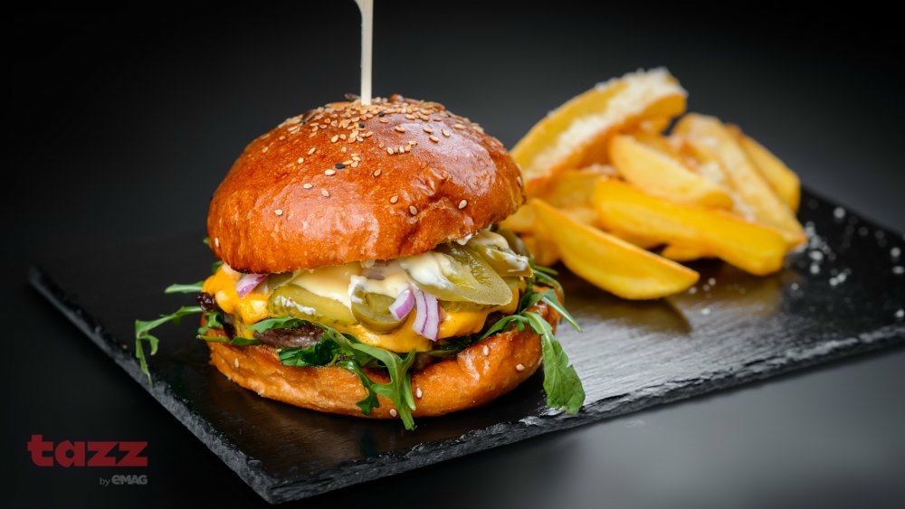 Chiflă brioche, carne de vită, brânză cheddar, roșii, salată, maioneză, ketchup, sos barbeque, cartofi prăjiți