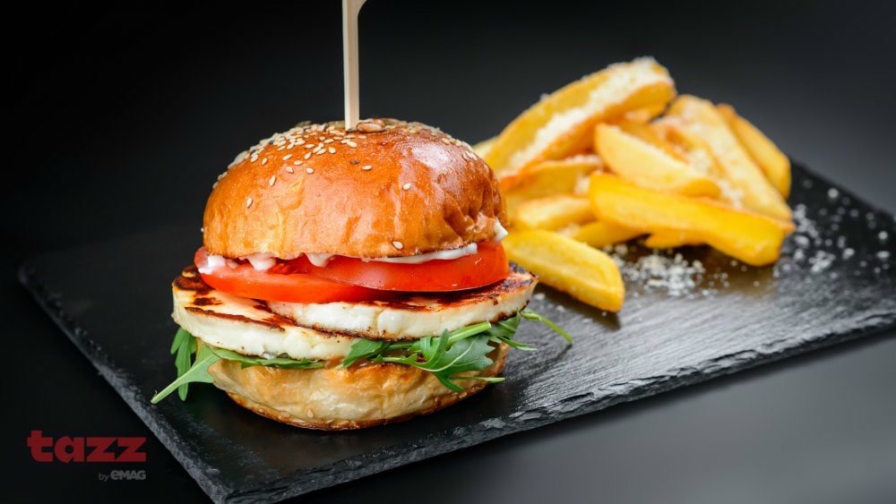 chiflă brioche, brânză halloumi, salată, ciuperci, roșii, maioneză, ketchup, cartofi prăjiți