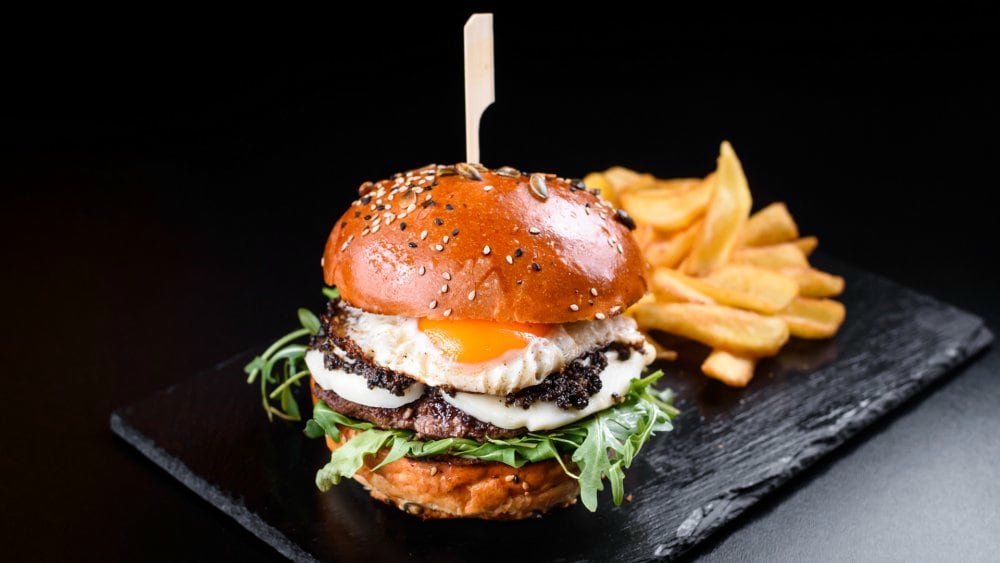 chiflă brioche, carne de vită, mozzarella, ou, salsa de trufe, ceapă roșie, rucola, maioneză, ketchup, sos burger, cartofi prăjiți