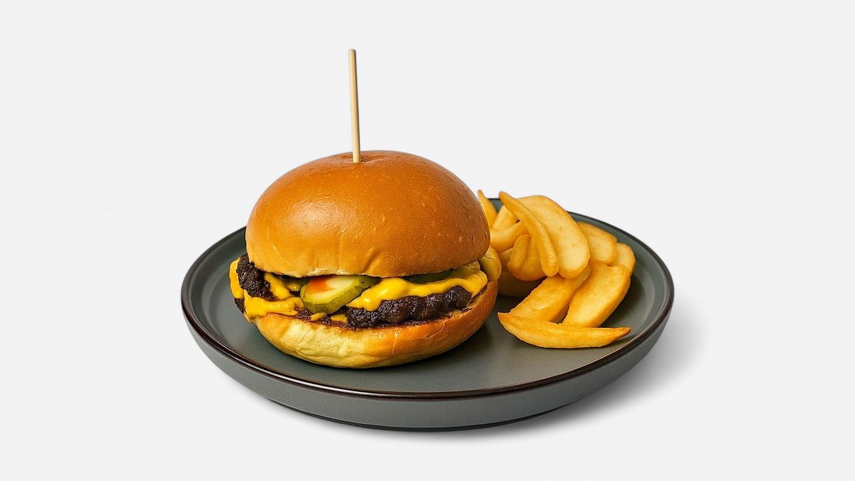Chiflă brioche, carne de vită*2, brânză cheddar*2, bacon, roșii, castraveți murați, ceapă roșie, maioneză, ketchup, sos burger, cartofi prăjiți
