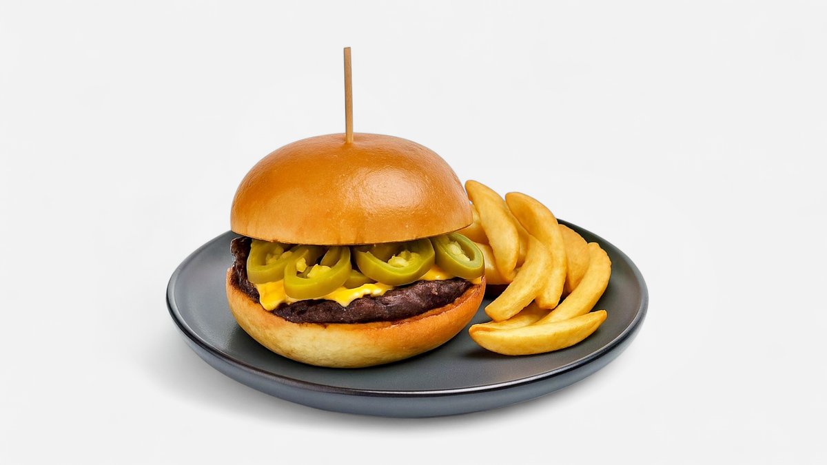 Chiflă brioche, carne de vită, brânză cheddar, castraveți murați, ceapă roșie, jalapeno, salată rucola, maioneză, ketchup, sos burger, cartofi prăjiți