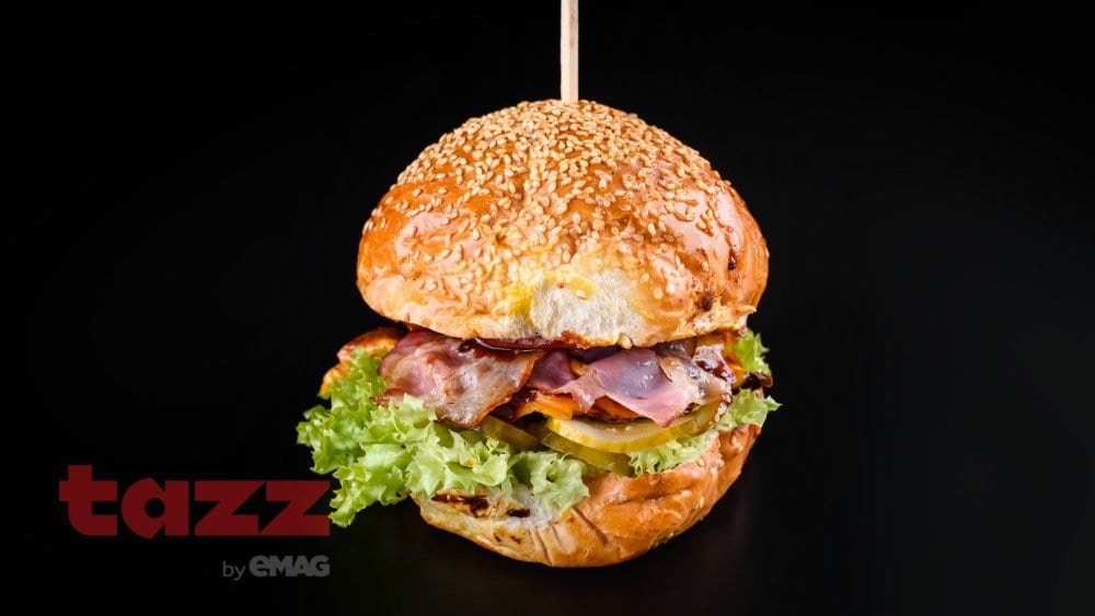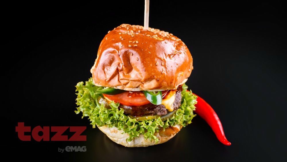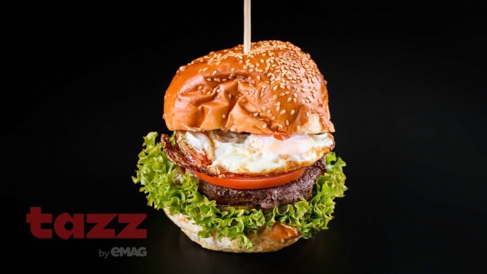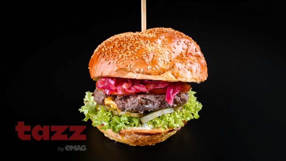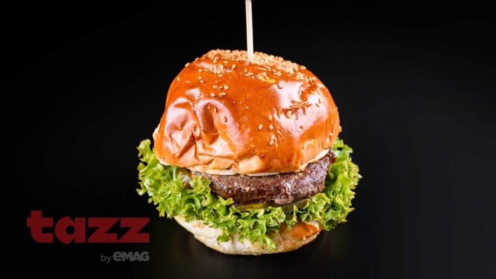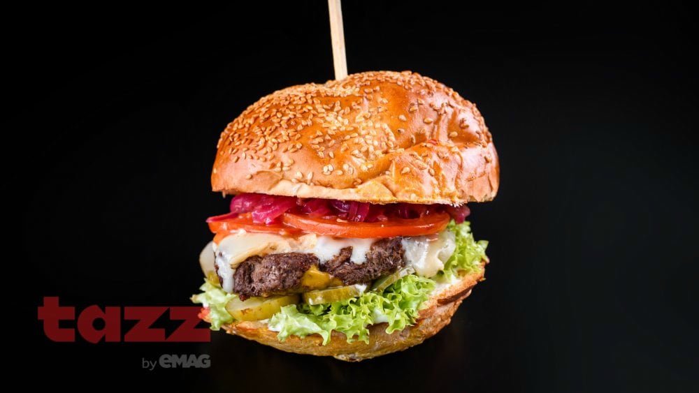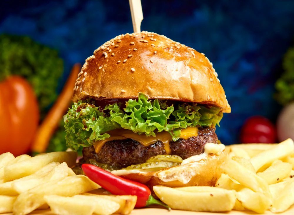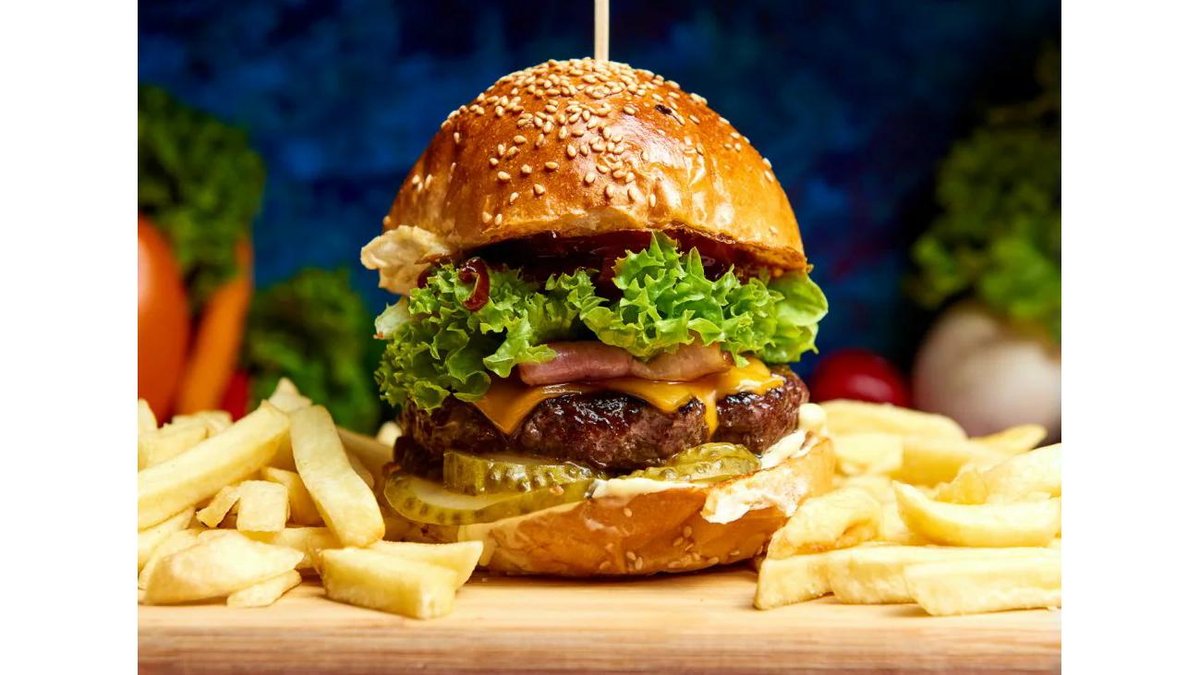 Chiftea de vită, brânză cedar, salată, castraveți murați, roșii, ceapă, sos maioneză, kechup, cartofi prajiti 300 g