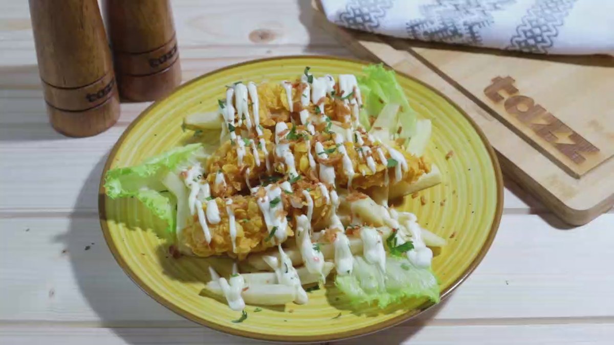 Crispy de pui 3 buc, cartofi prăjiți, maioneză picantă, ceapă crocantă, cheddar topit, pătrunjel 280g