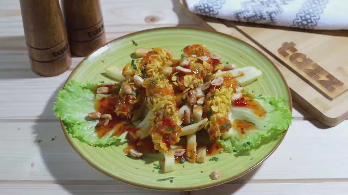 Crispy de pui 5 buc, cartofi prăjiți, sos chilli, alune prăjite, chives tocat 300g