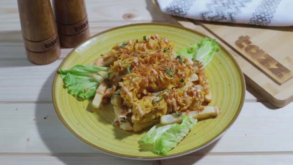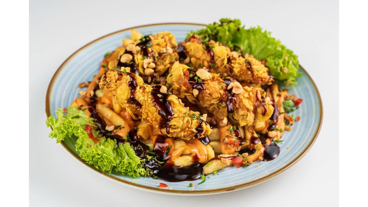 Crispy de pui 5 buc, cartofi prăjiți, maioneză picantă, ceapă crocantă, cheddar topit, pătrunjel 300g