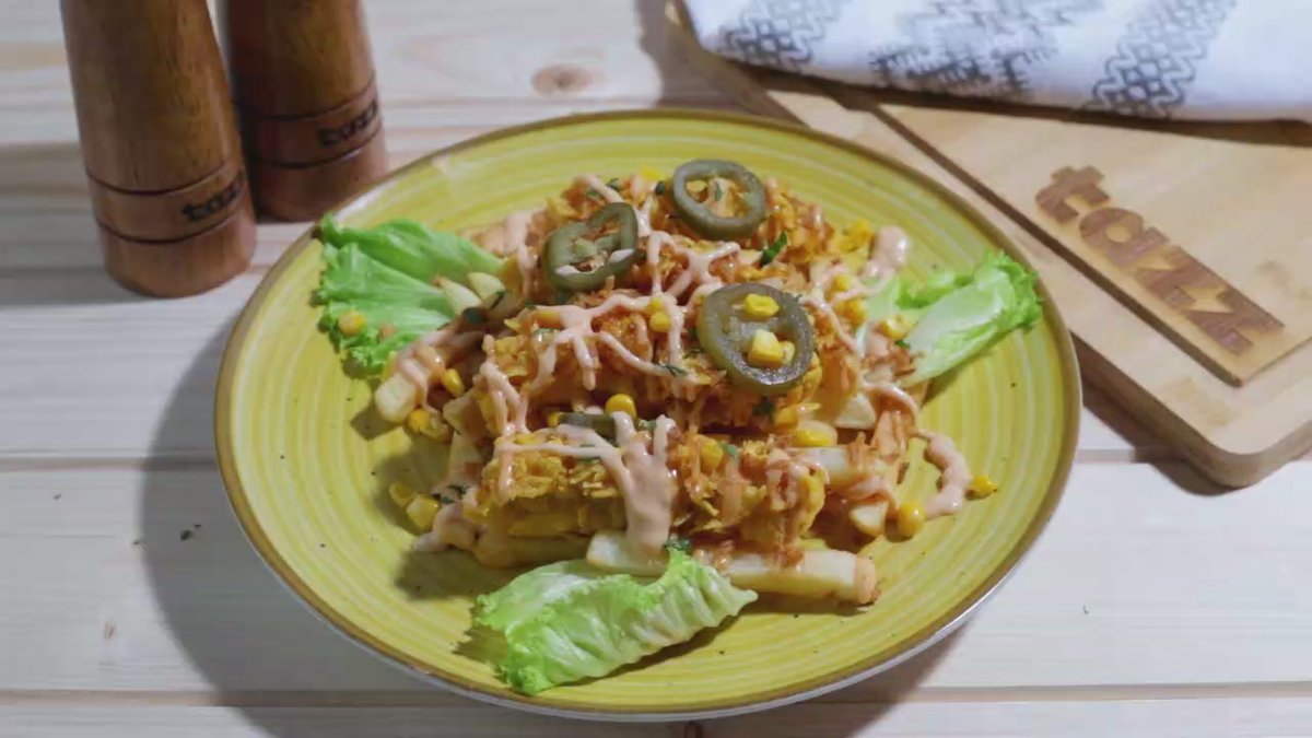 Crispy de pui 5 buc, cartofi prăjiți, maioneză picantă, jalapenos, boabe de porumb, cheddar topit 300g