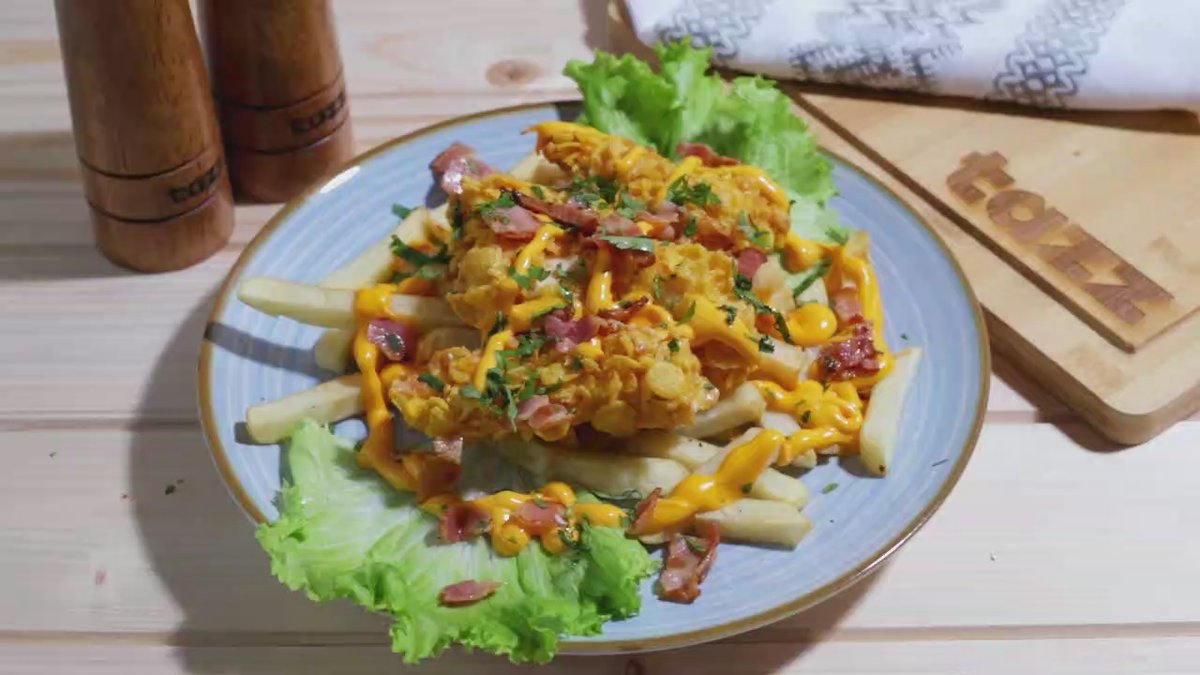 Crispy de pui 3 buc, cartofi prăjiți, cheddar topit, bacon crocant 280g
