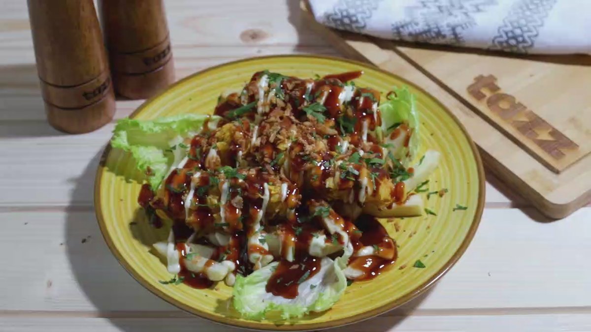 Crispy de pui 3 buc, cartofi prăjiți, sos bbq, ceapă prăjită, cheddar topit 280g