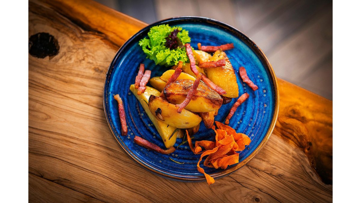 Crispy de pui 3 buc, cartofi prăjiți, sos de usturoi, bacon crocant, pătrunjel 280g