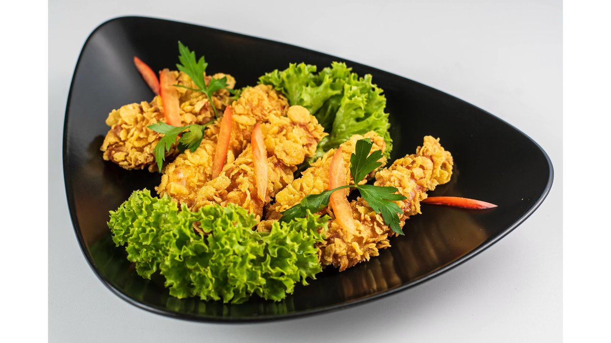 Crispy de pui 3 buc, cartofi prăjiți, sos chilli, alune prăjite, chives tocat 280g