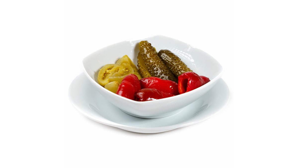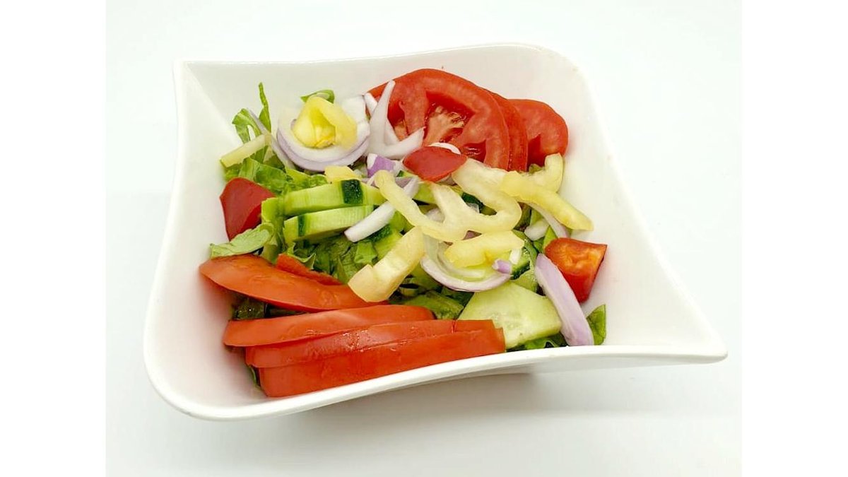 Chiftea de vită, salată, castraveți murați, roșii, sos maioneză, kechup, ceapă, cartofi prajiti - 300gr
