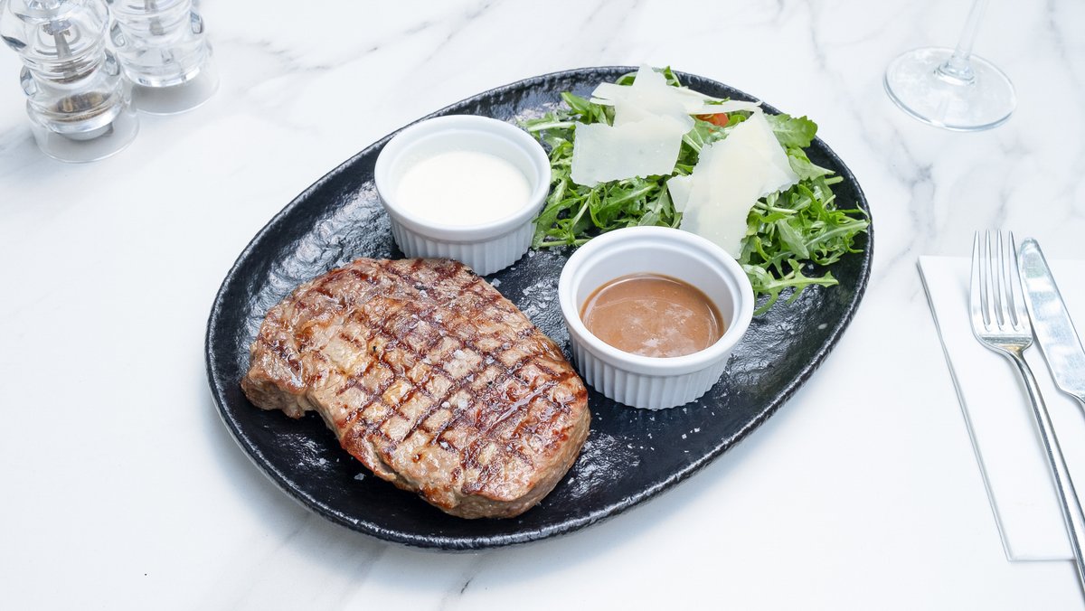 Antricot de vită (220g), Roșii cherry (100g), Rucola (70g), Parmezan 70g (Lapte de vacă 3%, Sare), Smântână lichidă 35% 60g (Lapte de vacă gras, pasteurizat), Gorgonzola DOP 20g (Lapte de vacă 3%, Sare), Sos Demi Glace 10g (Zahăr, Piper măcinat, Sare), Unt 82% grăsime 10g (Lapte pasteurizat 0.1% Natura), Coniac (5g), Usturoi (5g), Sare (4g), Piper măcinat (1g)