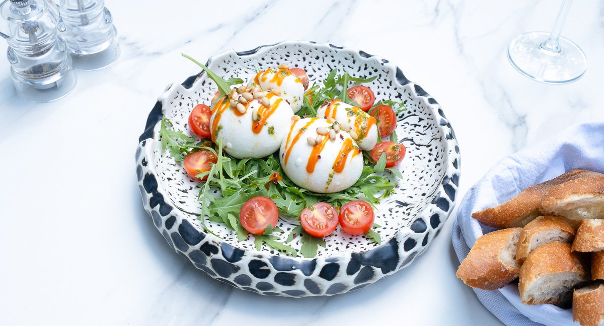 Burrata 200g (Lapte de vacă 3%, Smântână 20%, Sare), Roșii cherry (180g), Roșii (120g), Rucola (50g), Ulei măsline (25g), Muguri de pin (6g), Busuioc (4g), Sare (4g), Piper măcinat (2g)